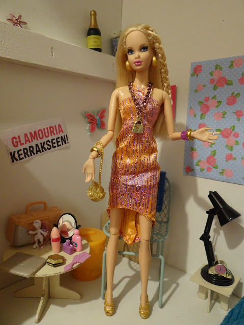 Shania: Ja pyh! Minä en laittaisi päähäni edes sitä omistamaani pinkkiä tonttulakkia, saati sitten TAVALLISTA punaista! Sitä paitsi tonttulakkini on Dollywoodissa. Tämä lahjaruusuke saa luvan käydä tonttulakista! Katso nyt, tämä sopii täydellisesti tämän mekon kanssa, jonka toin tullessani Dollywoodista.