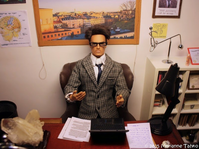 Tri. Badcoke: Hmm... Tunnutte käyttävän hieman liikaa alkoholia. Siinä saattaa olla syy harhoihinne. Testataanpa nyt sellaista asiaa, että koetatte vähentää alkoholin käyttöä ja katsomme sitten ensi viikolla onko tilanne tästä parantunut. Jos harhanne jatkuvat, niin sitten katsomme sopivaa lääkitystä. Mutta ensin mieluusti minimoisin psyykeenne häiritsevästi vaikuttavat ulkoiset tekijät. Sopiiko näin?