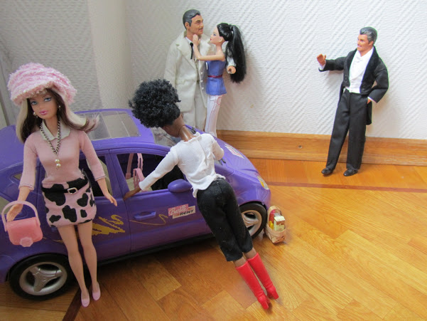 Hetkeä myöhemmin Barbie Rentissä autoa vuokraamassa.